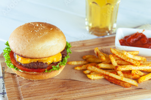 burger, hamburger, french, salad, board, eating, grill, epicure, wood, grilled, classic, potato, meat, onion, fast food, meal, lettuce, bar-b-q, bun, slice, beef, fried, delicious, green, unhealthy, red, snack, leaf, eatery, vegetable, ketchup, tomatoes, tasty, bacon, cutting, sandwich, cheese, wooden, mustard, fresh, bread, cooking, baked, food, sauce, juicy, fries, fast, ravenous