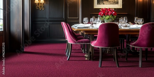 red, carpet, dining, room, table, chair, wine, goggles, elegant, luxury, interior, design, modern, dark, wood, paneling, formal, plush, velvet, setting, fine, home, decor, classic, sophisticated, upscale, eatery, ambience, comfortable