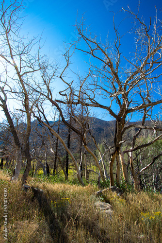 Burned trees and recovering understory at Cache La Poudre Wild and Scenic River Valley in Colorado