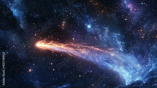 Burning comet tail streaking across the night sky, surrounded by bright stars and deep nebulae generative ai