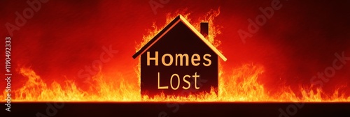 Burning House Loss Concept - House fire, destruction, devastation, loss, emergency. Symbolizes tragedy, despair, and rebuilding.