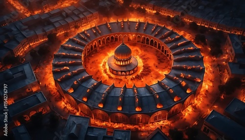 mosque, city, fire, burning, inferno, night, scene, flames, architecture, aerial, view, orange, red, glow, dramatic, fiery, destruction, chaos, apocalyptic, intense, heat, smoke, building, dome, circular, structure, historical, cultural, heritage, disaster, emergency, damage, loss, devastation, tragedy, image, photo, artwork, digital