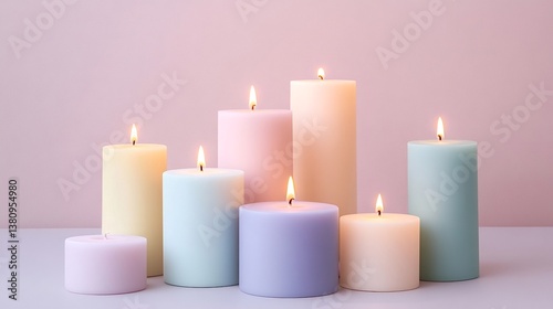 Burning pastel candles in various sizes and colors create a warm, relaxing atmosphere against a simple pink backdrop, embodying tranquility and cozy home decor