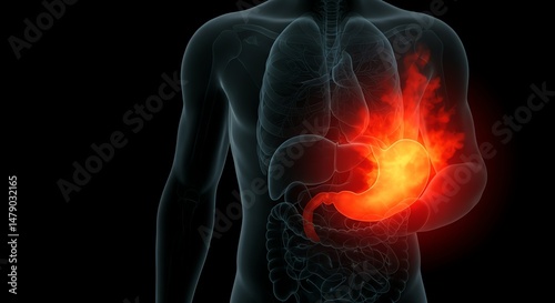 stomach, pain, burning, inflammation, medicals, illustration, anatomy, digestive, system, health, body, human, internal, organ, visceral, intense, fiery, red, hot, graphic, dark, dramatic, powerful, image, health care, treatment, diagnosis, disease, suffering, severe, ulcer, acid, medicine, clinical, patient, care, emergency, hospital, commercial, stock