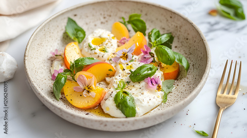 peach, salad, basil, creamy, food photography, delicious, healthy, epicure, receipe, cooking, fresh, bowl, olive oil, speckled, white, table, meal, dinner, lunch, dessert, culinary, gastronomy
