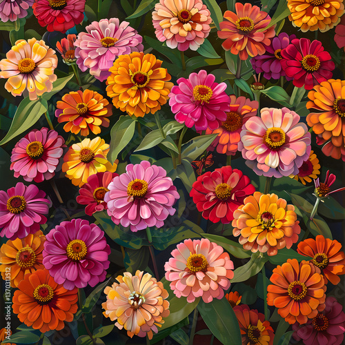 Burst of Colors: Lush and Vibrant Zinnia Flower Garden under the Clear Blue Sky