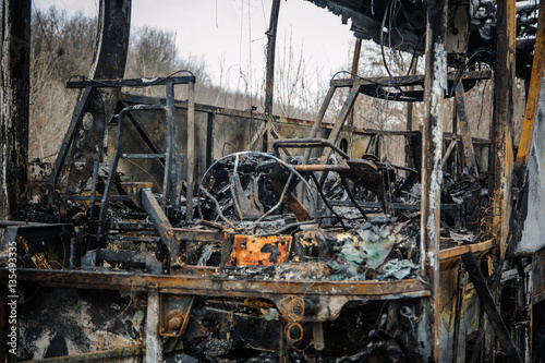 bus, fire, car, vehicle, destroyed, burnt, after, transportation, transport, danger, burn, disaster, accident, auto, travel, building, road, automobile, explosion, emergency, crime, crash, street, traffic, public, down, drive, destruction, vandalism, black, metal, city, security, engine, damage, incident, rust-eaten, insurance, war, conflict