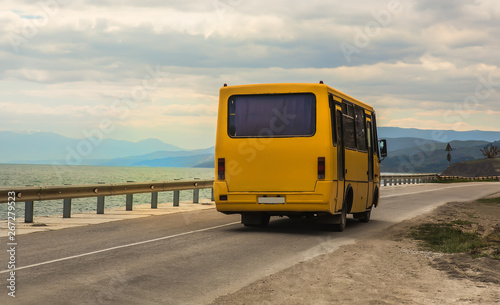bus, road, beach, coast, transportation, way, water, green, sky, blue, summer, sea, vehicle, beautiful, russia, locomotive, tree, day, logistic, moving, traveling, structure, horizon, light, coach, racing, travel, landscape, island, view, trip, rock, vacation, bay, coastline, journey, nature, mountain, transport, touristic, scenic, cliff