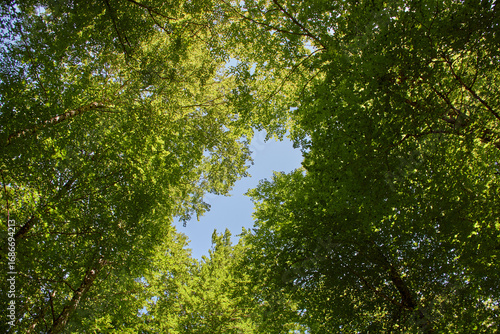 tree, forest, nature, leaf, heaven, sun, foliage, spring, wood, blue, oak, upward, season, sunlight, environment, day