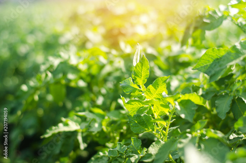 bush plant of young potato growing in the field, farming, agriculture, vegetables, eco-friendly agricultural products, agroindustry, mineral fertilizer, closeup