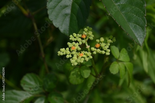 Bushkiller ( Cayratia japonica ) flowers. Vitaceae perennial vine. Small green flowers bloom in summer and orange discs remain after flowering.