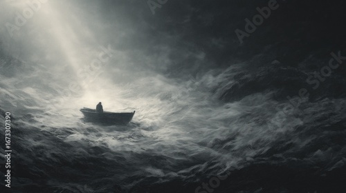 small boat, dramatic sky, beam of light, hope, struggle, isolation, monochrome, greyscale, high contrast, resilience, journey, loneliness, determination, atmospheric, moody, intense, dark clouds, vulnerability, black-and-white, metaphoric, perseverance, inspirational, cinematic