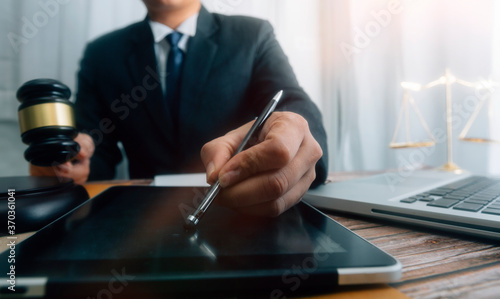 Business and lawyers discussing contract papers with brass scale on desk in office. Law, legal services, advice, justice and law concept