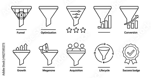 business, marketing, icon, set, strategy, line, growth, optimization, conversion, megaphone, acquisition, life cycle, success, badge, report, chart, goal, target, plan, funnel, development, diagram