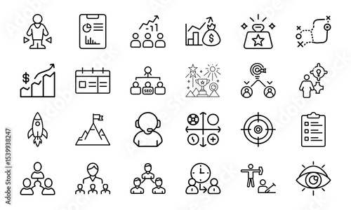 icon, business, strategy, planning, teamwork, goal, target, success, achievement, leadership, management, finance, graph, chart, calendar, time, money, growth, marketing, vision, insight, analysis, process, decision, communication, collaboration, meeting, conference, solution, idea, innovation, development, progress, sharpened, vector, set, outline, minimal, monochrome, design, infographic, illustration