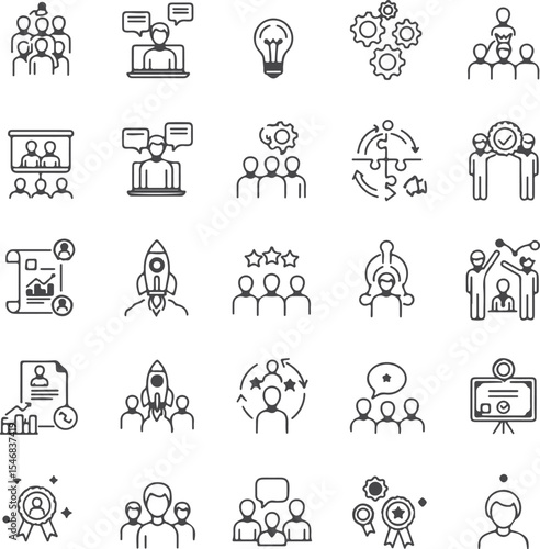 Business and Teamwork Icons Depicting Collaboration Innovation and Success in a Professional Setting Outline Style