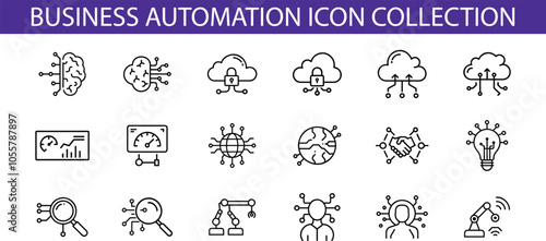 business, automation, icon, collection, workflow, cloud, computing, datum, analysis, process, optimization, artificial, intelligence, network, connection, integration, technology, digital, transformation, efficiency, productivity, innovation, dashboard, monitoring, robotic, ai, machine, learning, strategy, management, control, system, improvement, growth, success, future, solution, vector, graphic, design