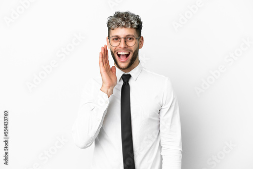 Business caucasian man isolated on white background with surprise and shocked facial expression
