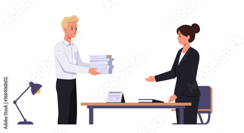 business, office, work, colleague, document, paper, exchange, handing, giving, receiving, desk, table, meeting, communication, cooperation, teamwork, professional, corporate, white-collar, formal, suit, shirt, blond, hair, bun, woman, man, illustration, vector, cartoon, flat, design, modern, contemporary, agreements, collaboration, sharing, information, paperwork, file, stack, handing over, workplace, career, job, employee