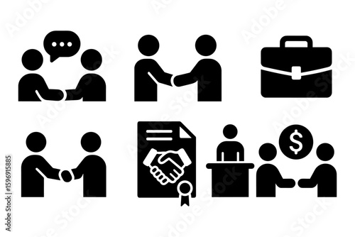 silhouette, communication, partnership, business, icon, handshake, contract, agreements, meeting, deal, office, collaboration, negotiation, conversation, teamwork, briefcase, certification, currency, dollar, presentation, dialogue, discussion, people, interaction, network, symbol, monochrome, connection, corporate, professional, commerce