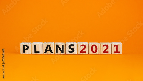 Business concept of planning 2021. Wooden cubes with the inscription 'Plans 2021'. Beautiful orange background, copy space.