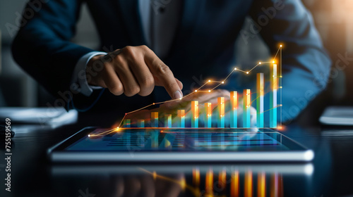 Business concept. The manager controls the company shares. Company's profit and loss statistics.