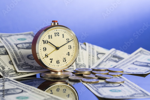 Business concept. Time is money. Vintage clock near american dollar cash and coins with nice blue gradient background