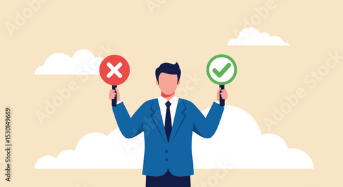 choice, decision, right, wrong, approval, choose, correct, business, option, conflict, moral, yes, occupation, false, poll, no, true, cross, positive, advice, agree, answer, signs, discussion, contemplation, control, expertise, good, idea, individuality, mark, job, meeting, planning, problem, questionnaire, round, rule, select, solution, thoughtful, tick, variation, vote, men at work, accept, businessman, incorrect, ok