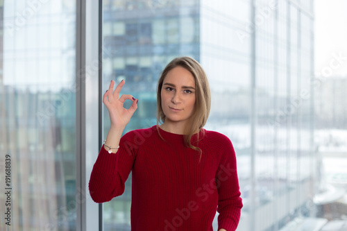 business girl at the window shows a finger that everything is ok. approval from a partner. business negotiation
