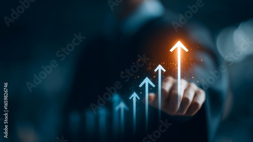 growth, business, arrow, success, upward, achievement, finance, investment, market, increase, development, progress, strategy, planning, goal, target, future, opportunity, leadership, businessman, hand, pointing, visualisation, concept, digital, technology, corporate, innovation, improvement, direction, motivation, inspiration, rise, performance, indicator, chart, datum, analysis, economic, financial, return, earning, profit, expansion, positive, trend, vision