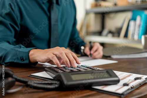 Business hand pressing on calculator for calculating cost estimating.