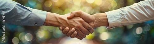 Business handshake between two people with a blurred background, representing partnership, agreement, cooperation, and teamwork.