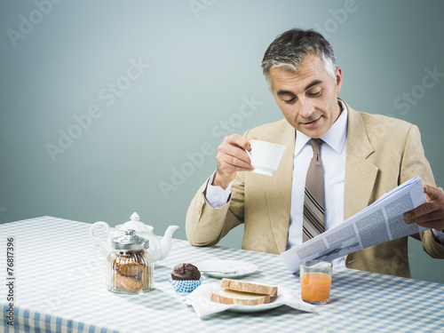 biscuit, bread, breakfast, businessman, checked, cheerful, chocolate, hot drink, comfortable, confident, cookie, delicious, dish, drinking, eating, elegant, food and drink, friendly, happiness, healthy eating, man, meal, morning, muffin, newspaper, nutrient, orange juice, reading, relax, satisfaction, smiling, sunglasses, sweet food, table, tea, teapot, attaching, toast