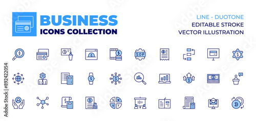 Business icons collection. Line icons, doutone style, editable stroke, vector illustration. business intelligence, credit card, connections, care, expansion, dollar, business, calculator, taxes.