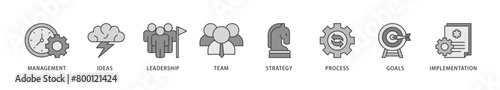 Business icons set collection illustration of management, ideas, leadership, team, strategy, process, goals, and implementation icon live stroke and easy to edit