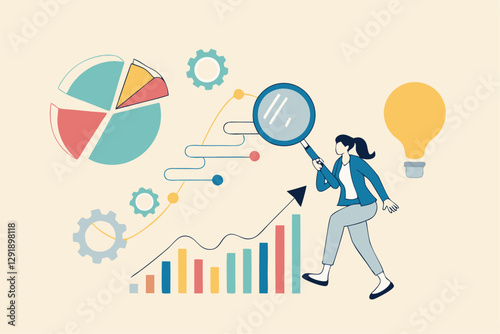 Business intelligence data analysis for business insight, database or statistics, marketing technology or data funnel or indicator concept, businesswoman work with data analysis and magnifying glass.