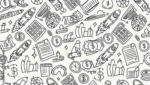 Business job icon doodle seamless pattern background. Business teamwork, office, career concept doodle line sketch style pattern with money, rocket, calculator element. perfect any project.