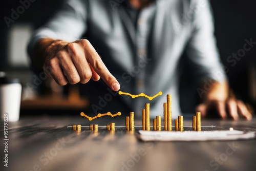 Business leader pointing to a golden trend line during a presentation, showcasing positive revenue growth, revenue growth, strategic planning