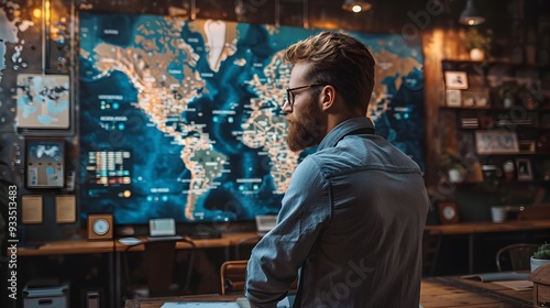 Business Leader Strategizing with Digital Global Market Mapping in Minimalist Office