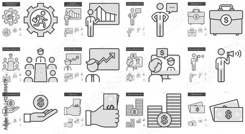 vector, business, graphic, illustration, design, drawing, hand-drawn, draw, icon, isolated, outline, background, black, line, flat, minimal, linear, scalable, success, meeting, businessman, man, male, office, person, human, graph, arrow, chart, presentation, seminar, conference, character, people, layout, management, occupation, manager, report, running, briefcase, video, insurance, salary, stack, coin, banknote, money, set
