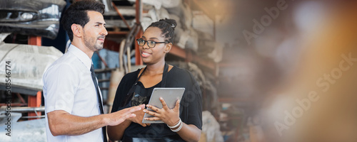 Business man and woman discuss and looking at tablet, brainstorming nd cooperate concept