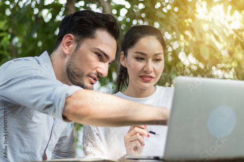 couple, communication, freelance, cyberspace, work, business, businessman, affection, beautiful, colours, comfort, computer, concentration, design, garden, grass, green, hand, happiness, home, job, laptop, leaning, lifestyle, luxury, man, notebook, park, partner, person, portrait, sharing, sitting, smile, space, technology, together, 2, woman, wooden, young