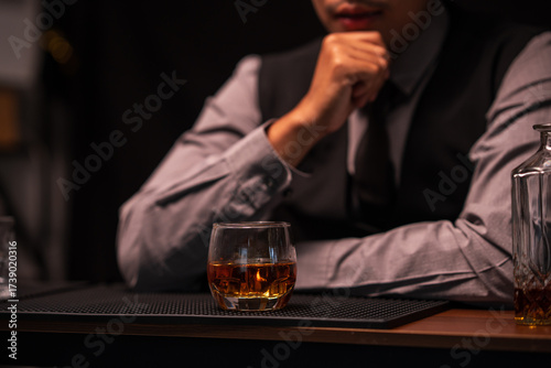 Business man bartender pours whiskey into a glass, sitting sadly in a restaurant