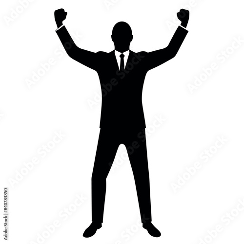 Business man cheers and clenches his fists, vector black color silhouette, isolated white background