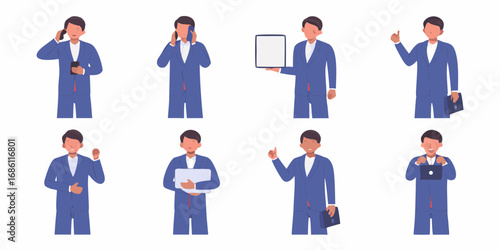 business, man, suit, blue suit, white shirt, attaching, briefcase, laptop, tablet, phone, smartphone, thumb up, success, communication, technology, office, professional, career, work, job, meeting, presentation, gesture, pose, collection, set, illustration, vector, cartoon, character, male, person, isolated, white background, happy, confident, friendly, positive, activity