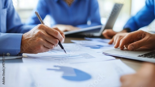 business, meeting, analysis, team, workspace, office, work, people, desk, strategy, finance, datum, chart, graph, collaboration, discussion, presentation, laptop, computer, technology, document, paper, pen, hand, finger, table, close, up, sharpened, professional, corporate, management, research, planning, growth, success, productivity, future, progress, development, white, blue