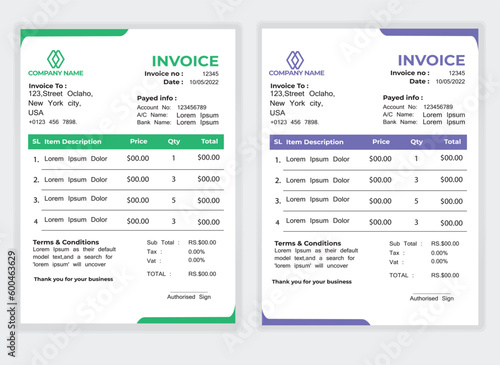 Business Minimal Corporate Invoice design template vector illustration bill form price . Creative template and stationery design payment agreement design template Cash Memo, Vector Quotation Design