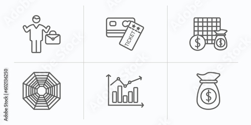 business outline icons set. thin line icons such as man success, credit card and ticket, economy games, spider chart, measuring success, dollar on business time vector.
