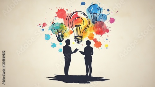 business, partner, discussing, idea, brainstorming, creativity, collaboration, teamwork, strategy, planning, innovation, silhouette, illustration, colourful, concept, art, communication, dialogue, exchange, vision, project, organisation, meeting, success, inspiration, analysis, growth, development, professional, networking, finance, design, background, splash, light bulb, energy, thinking, solution, graphic, artwork, vector, modern