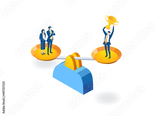 Business people and scale. Partnerships. New start up. Isometric iconographic of business working space with people, business concept
